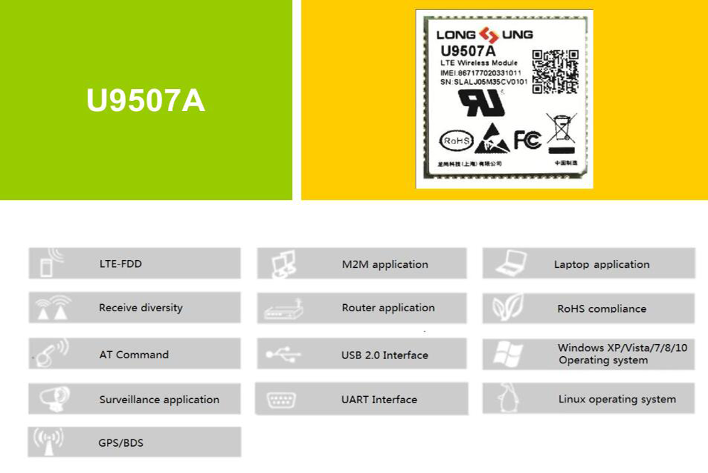 U9507A is a new generation of Longsung LTE wireless module, rich of Internet protocols, and indstry- standard interfaces and abundant functionalities. It can be designed in many kinds of applications which can work on LTE-FDD/UMTS/GSM/GPS/GLONASS (Optional) network.。
